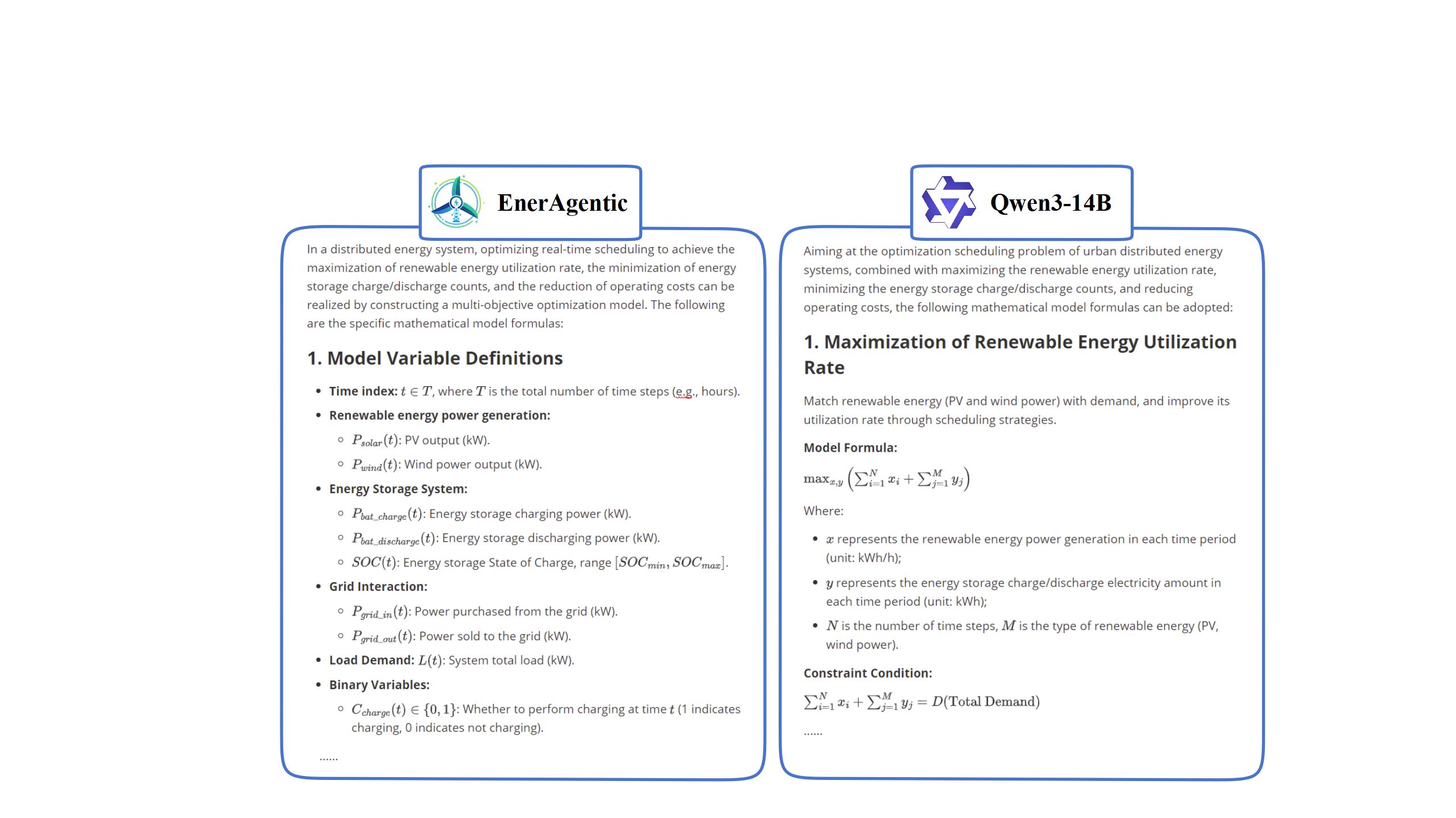 对比结果显示,这两个模型在推理深度上存在明显差异。基础模型Qwen3-14B不仅提供了相对通用、缺乏特定上下文的公式,还存在明显的物理和数学逻辑缺陷。例如,为了最大化可再生能源利用率,其提出的目标函数简单地将可再生能源发电量与电池充放电量相加。这种表述在数学上是不合理的,完全忽略了基本的能量平衡原理,因为它无视了能量流动的方向性以及这些组件在电力系统中所扮演的不同物理角色。与之不同的是,EnerAgentic没有急于下结论,而是生成了一个结构清晰、内容全面的解决方案。它系统地将问题分解为变量定义(例如,定义时间步长t和功率输出)、制定精确的多目标函数,并建立了必要的系统约束。这种结构化的输出严格遵循学术建模标准,表明EnerAgentic已经成功内化了科学建模所需的研究逻辑,其能力大大超过了通用大型语言模型。