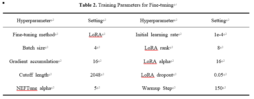 最后,为确保训练稳定性并加速收敛,我们采用了结合预热(Warm-up)和余弦退火(Cosine Annealing)的学习率调度策略。在训练初期,预热阶段从较低的初始学习率开始,逐渐增加到预设值,有效避免了在模型参数尚未稳定时可能出现的梯度爆炸或训练发散问题。预热阶段结束后,余弦退火策略接管学习率,使其随着训练步数的增加按照余弦函数曲线平滑衰减。这种先升后降的动态调整机制有助于模型在训练后期更精细地探索损失函数的局部最小值,提升最终的收敛效果。其余微调训练参数如表2所示。
