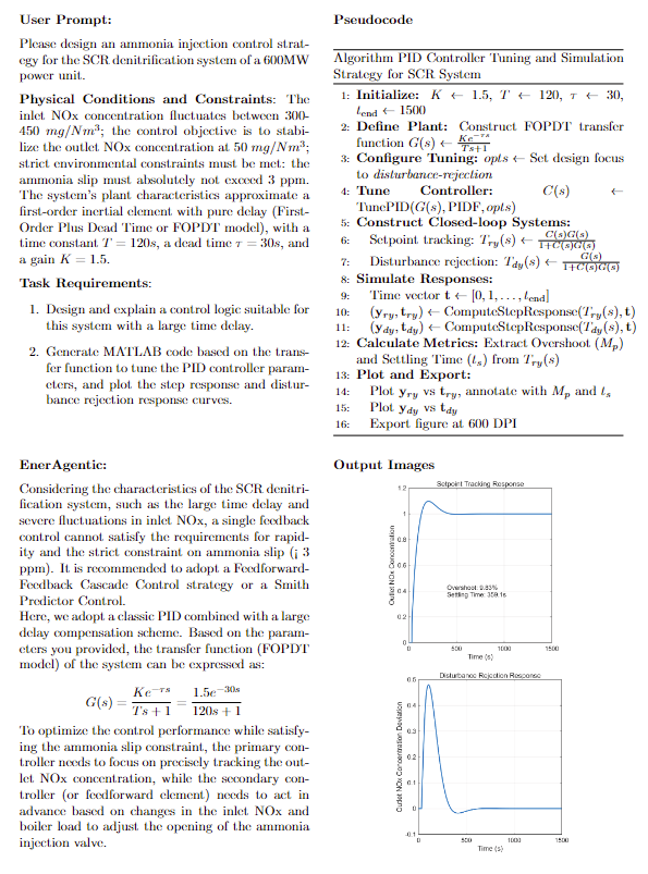 然而,执行现实世界中的综合能源系统任务往往需要超越静态的数学公式推导,动态调用外部工程工具。因此,为了进一步证明所提出的多智能体协同推理框架的实际有效性,我们展示了第二个案例研究,重点是动态控制系统仿真和MATLAB代码生成。如图10所示,该模型的任务是为600MW发电机组的选择性催化还原(SCR)脱硝系统设计氨喷射控制策略。输入提示包含特定的物理参数和严格限定的环境约束。