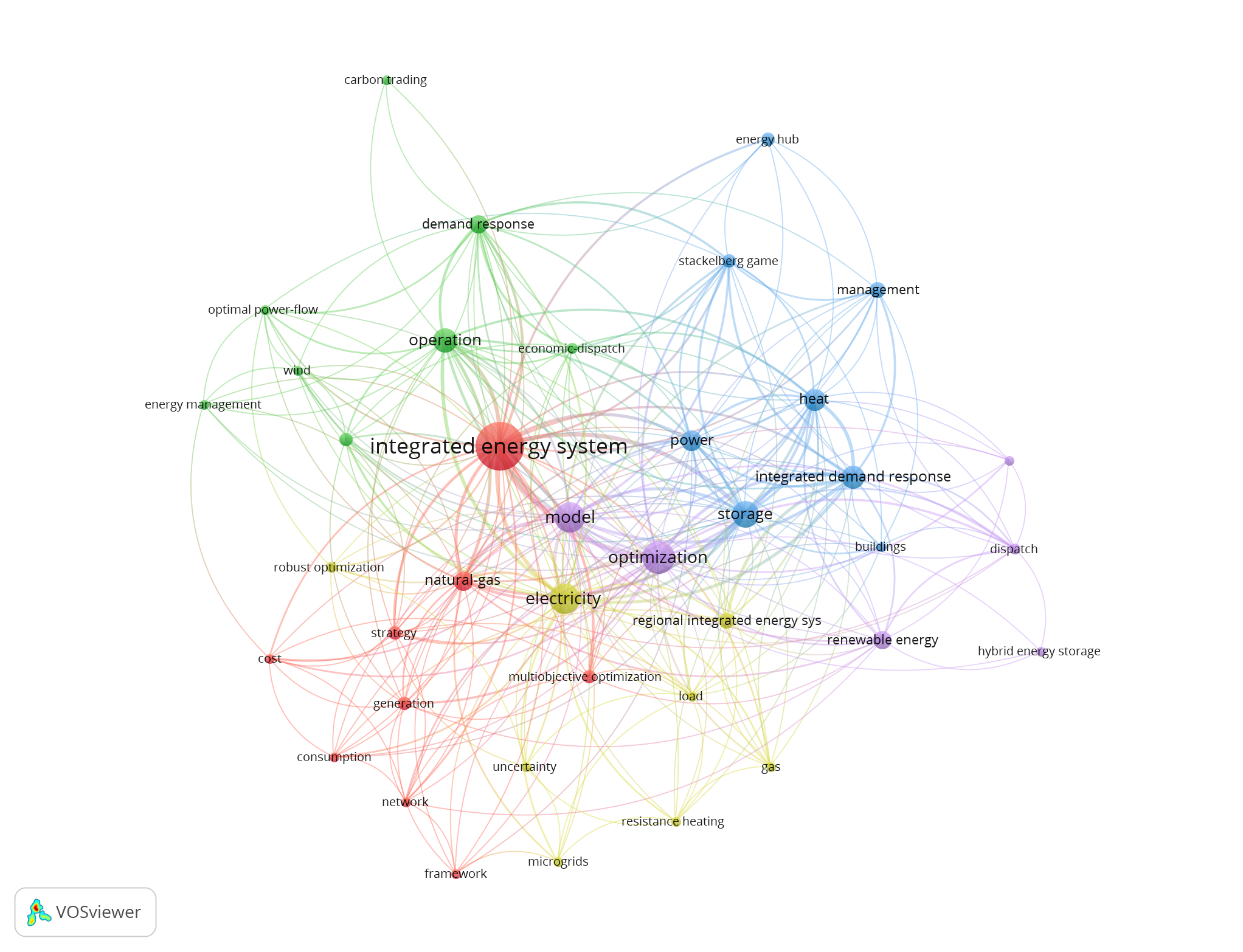 我们首先进行了关键词共现分析,以精确定位当前的研究热点。如下图所示,关键词共现网络关键词聚类图可视化了该领域复杂的关系和核心主题结构,其中高频关键词形成了不同的聚类,突出了高度互联的节点,如“综合能源系统”“能源管理优化”和“斯塔克尔伯格博弈存储”。这种网络结构方法不仅有助于划定语料库的语义边界,还揭示了不同子领域之间的紧密联系、知识演化的态势以及该领域内潜在的跨学科方向。这种聚类有助于划定语料库的语义边界。