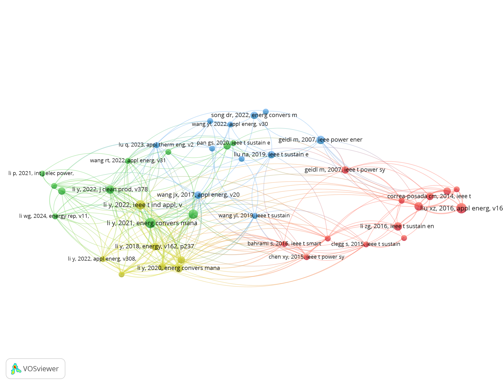 同时,我们应用了参考文献共被引分析来确定该领域的知识基础。下图所示的参考文献共被引网络揭示了关键文献之间的引用关系,突出了综合能源系统(IES)领域内最具权威性和基础性的文献。基于上述文献计量分析的最新结果,研究人员进一步手动审阅了文献的标题、摘要和关键词,剔除了相关性较低的文献。最终,选取了201篇高质量的中文文章和196篇高质量的英文文章作为核心学术语料库。