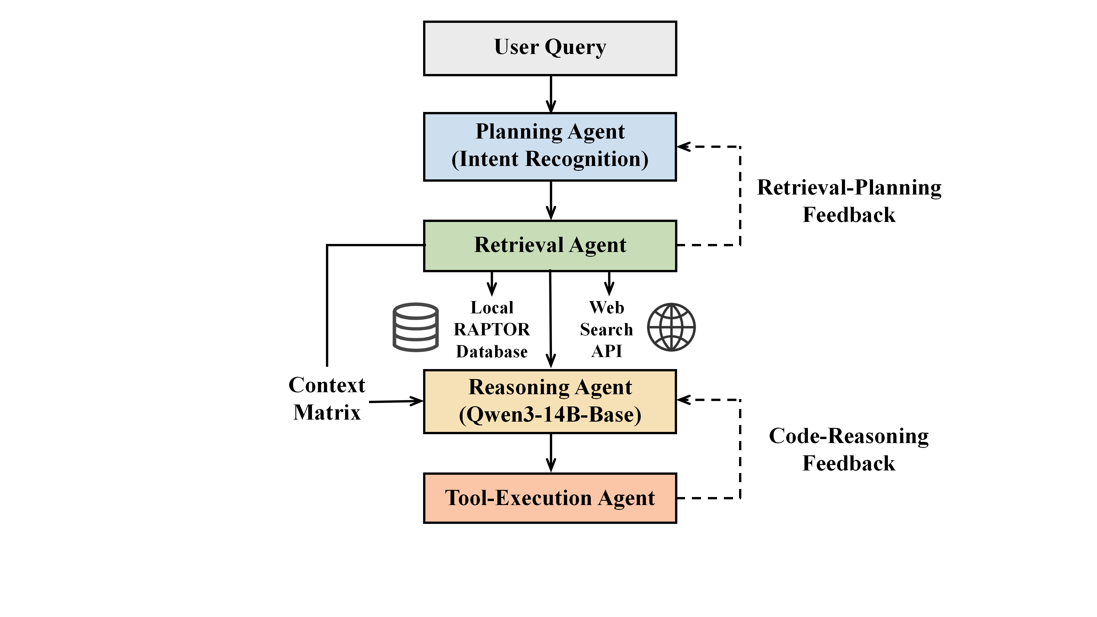 与传统的单向流水线模型不同,EnerAgentic 建立了两个内部反馈循环:代码-推理反馈循环和检索-规划反馈循环。代码-推理反馈循环是指,当工具执行智能体在 Pyodide 沙箱或 MATLAB 引擎中执行仿真代码时遇到错误,它会将捕获到的异常回溯和错误日志封装成 JSON 格式的反馈消息,并发送给推理智能体。推理智能体根据错误日志进行自我反思,修正其先前的数学模型或约束条件,然后重新发出代码生成指令。检索-规划反馈循环是指,当检索智能体无法在本地 RAPTOR 树索引中获取具有足够置信度的知识节点时,它会向规划智能体返回低置信度状态码。基于此,规划智能体会触发重试机制,重写搜索关键词,或切换路由策略至网络搜索模式。这种“生成-执行-反馈-修正”的闭环框架赋予了该模型应对综合能源系统科研任务的可靠能力。