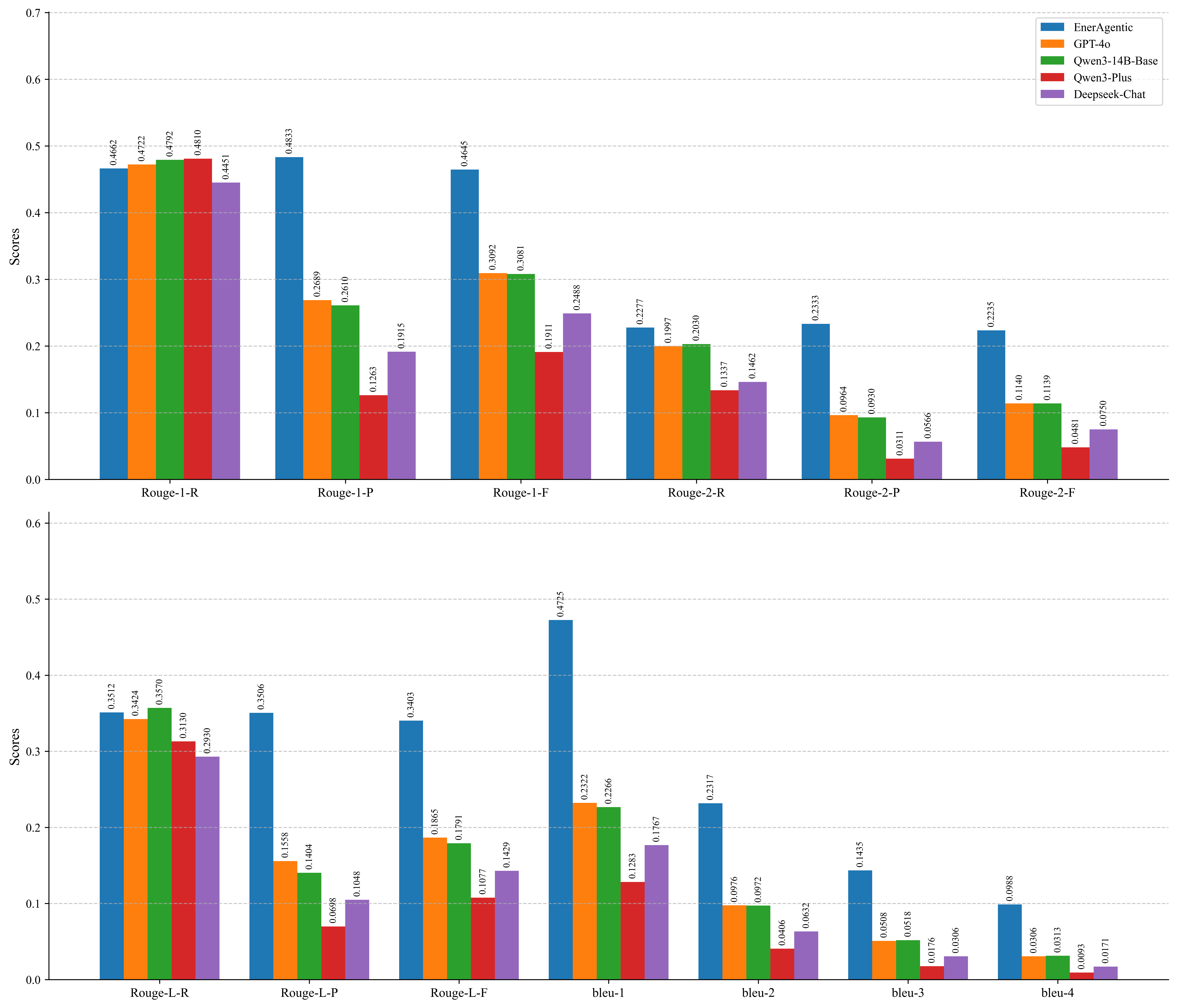 如上图所示,我们将EnerAgentic与其基础模型Qwen3-14B-Base以及几款最先进的商业大型语言模型(包括GPT-4o、Qwen3-Plus和DeepSeek-Chat)进行了比较。评估结果显示,EnerAgentic具有显著的性能优势。在ROUGE指标方面,虽然各模型的召回率(R)得分相对接近,但EnerAgentic取得了明显更高的精确率(P)得分,从而在Rouge-1、Rouge-2和Rouge-L中获得了最高的综合得分。这表明EnerAgentic能更准确地捕捉局部关键词和整体结构流畅性,且不会生成冗余或无关信息。