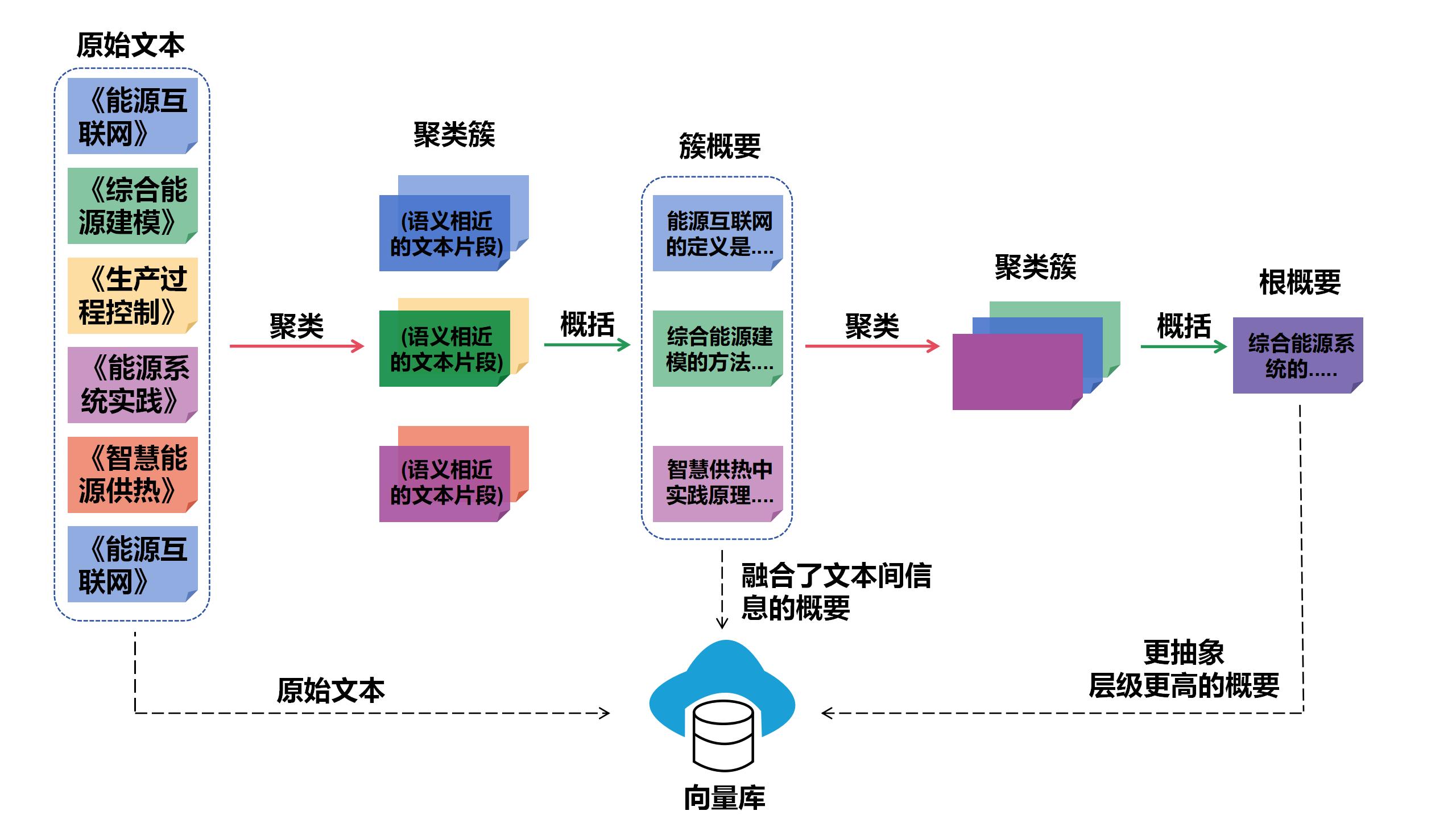 1. 语义聚类:首先,对细粒度文本块进行分析,并根据语义相似度将其分组为文本簇,例如,将所有关于“能源供暖”或“过程控制”的技术细节归为一组。